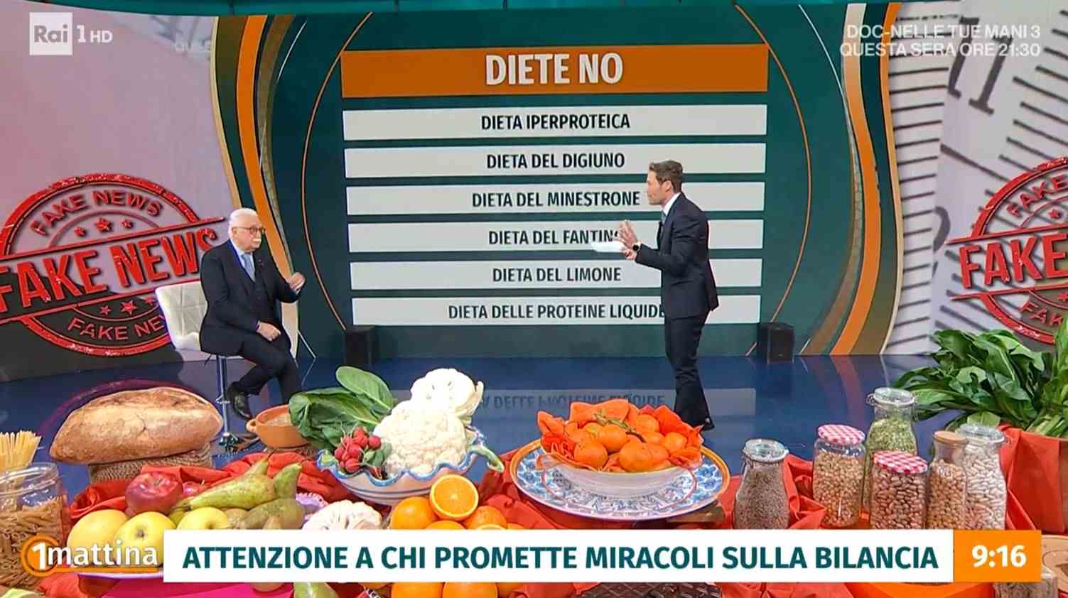 E ancora: “Io sono stato contattato da un giornalista dicendo che noi stavamo promuovendo un prodotto. Se c’è cascato il giornalista pensate chi guarda i social in modo così distratto, sono davvero convinti che si tratti di un prodotto miracoloso. Non fatelo, ascoltate prima il vostro medico di fiducia”. Il prof Calabrese, presente in studio ha precisato: “Diete così miracolose non esistono, perdere 13 kg in due mesi non esiste, si perde da mezzo chilo a un kg alla settimana con una dieta mediterranea fatta da un medico specialista, si perdono 4 kg se ne hai tanti da perdere o 2 se ne hai meno”.
