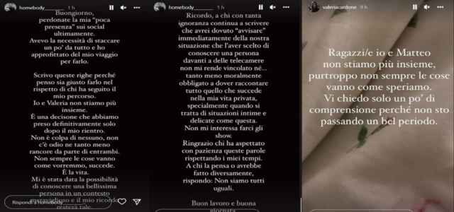 Dopo giorni di silenzio nonostante vari rumors e indiscrezioni, in seguito all’annuncio di Valeria, anche Matteo Ranieri ha affidato ad Instagram la sua versione dei fatti. “Io e Valeria non stiamo più insieme. È una decisione che abbiamo preso definitivamente solo dopo il mio rientro. Non è colpa di nessuno, non c’è odio né tanto meno rancore da parte di entrambi. Non sempre le cose vanno come vorremmo, succede. “Io e Valeria non stiamo più insieme. È una decisione che abbiamo preso definitivamente solo dopo il mio rientro. Non è colpa di nessuno, non c’è odio né tanto meno rancore da parte di entrambi. Non sempre le cose vanno come vorremmo, succede” – ha scritto Matteo.