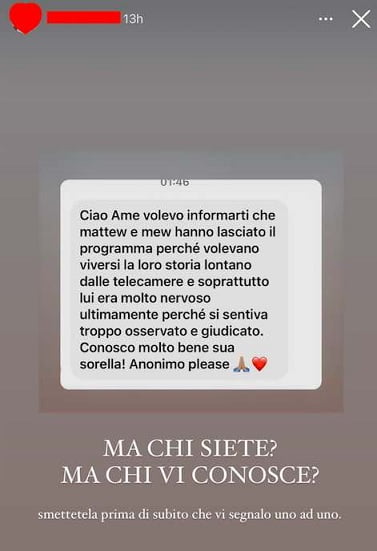 È stato lui a condividere un messaggio ricevuto da una utente che conoscerebbe bene la sorella di Matthew e, dunque, anche le motivazioni del suo ritiro da Amici. La segnalazione recita: “Ciao Ame volevo informarti che Matthew e Mew hanno lasciato il programma perché volevano viversi la loro storia lontano dalle telecamere. Questo è il motivo principale e soprattutto lui era molto nervoso ultimamente perché si sentiva troppo osservato e giudicato. Te lo dico perché conosco molto bene sua sorella! Comunque pubblica in anonimo please“.
