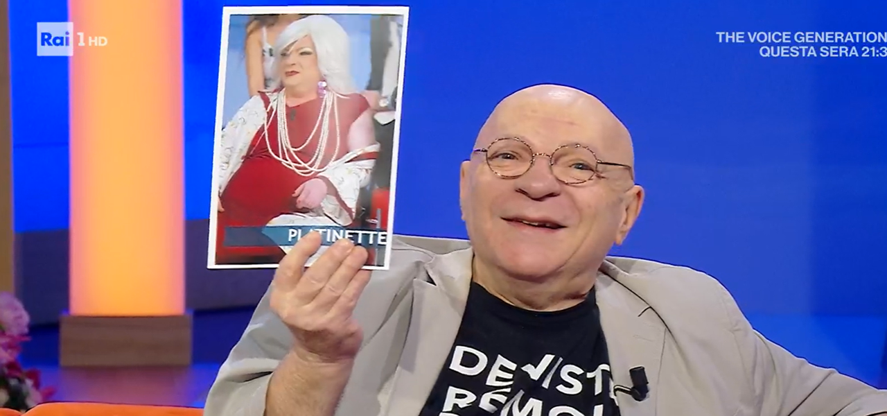 La conduttrice e giornalista, solo pochi minuti prima, era stata tra gli opinionisti di Caterina Balivo per parlare di attualità. Mauro Coruzzi, con la sua foto nei panni di Platinette tra le mani, ha quindi esordito: “Questa sembra una delle tue ospiti di prima… la giornalista…”