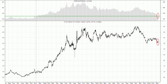 È vero, nell’arco della trascorsa settimana borsistica si è potuto assistere a un nuovo collocamento di Bot con scadenza annuale (14 marzo 2025) caratterizzato da un rendimento al 3,546% (in rialzo di 2 punti base). Centesimo più, centesimo meno, lo stesso ammontare era stato “prezzato” in occasione del recente minimo dello spread alimentando, quindi, il sopracitato (avventato) giudizio: vale la pena investire a dieci anni se lo stesso rendimento è, qui, pronto, a un anno?