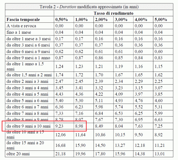 Come si può notare abbiamo parlato di «significativo rialzo dei prezzi», ma, nella pratica, a quanto corrisponde questo potenziale upside? L’unico e immediato riscontro a tale quesito è da ricondurre alla (a molti sconosciuta) duration modificata. Per poter rappresentare al meglio gli effetti di quest’ultima abbiamo utilizzato l’ultimo documento di Banca d’Italia in materia di “Disposizioni di vigilanza per le banche” (rif. 44° aggiornamento del 19 dicembre 2023) che, nella sua interezza, riesce a fornire un intero quadro.
