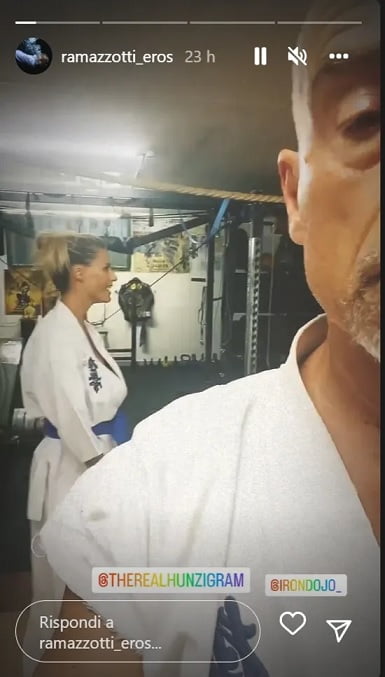 Per chi non lo sapesse, Eros Ramazzotti e Michelle Hunziker praticano il Karate Kyokushinkai. È stato il cantante romano, come ricorda Vanity Fair, a convincere Michelle a dedicarsi a questa disciplina circa un anno fa. Michelle si è subito appassionata al karate e si è allenata con costanza, tanto da diventare cintura blu dopo aver superato un duro esame a Bologna.