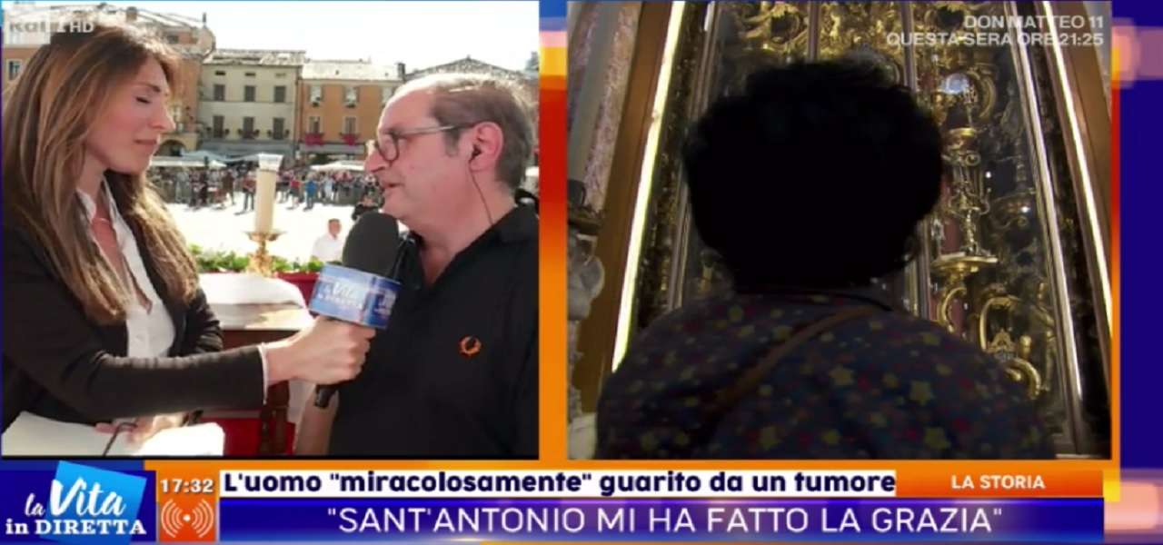 Ai microfoni del programma di Rai 1, Antonio Cataldi ha raccontato che nel corso di quella visita alla tomba del Santo di Padova sentì un forte bruciore dall’inguine alla testa durato però pochi secondi. Al suo ritorno a Fondi, ecco la scoperta: dagli esami svolti non risultava più alcuna traccia del tumore e nemmeno dagli altri esami che gli erano stati prescritti: “Certo, ho vissuto poi tre anni di calvario, in mezzo a morti e anche a bambini malati ma penso di essere un miracolato perché Sant’Antonio mi ha fatto la grazia per via delle mie preghiere” ha raccontato Cataldi in diretta, aggiungendo che ad oggi i medici non sono ancora in grado di spiegarsi quella guarigione tanto repentina quando sorprendente. “Io di mio non ho mai preso medicine, quindi penso che qualcuno ci abbia messo la sua mano” ha concluso il signor Antonio, dando anche la sua versione di cosa significhi avere fede: “Per me non è andare a Messa tutti i giorni ma basta dire il Rosario anche a casa o aiutare i poveri: questa è la fede che ci chiede Gesù…”.