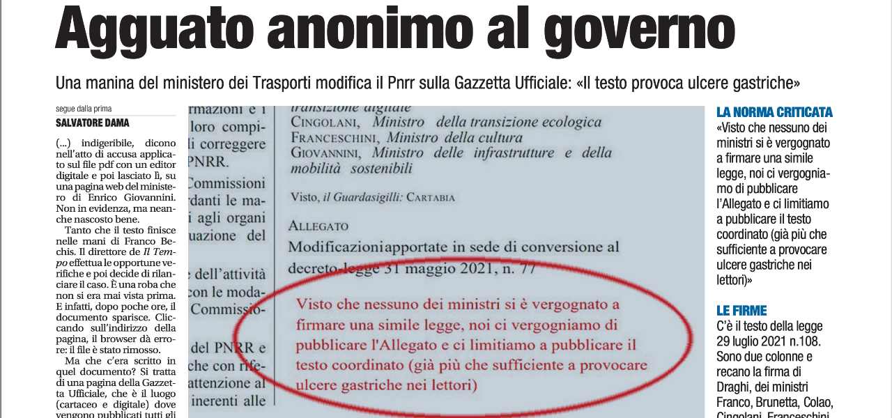 Ha davvero dell’incredibile quanto scoperto da “il Tempo” – rilanciato poi da “Open” e “Libero Quotidiano” – in merito al Decreto firmato dal Ministero dei Trasporti sul PNRR: in pratica una “manina” ha modificato il testo giunto in Gazzetta Ufficiale negli scorsi mesi, aggiungendo una nota di commento in “rosso” dai toni durissimi.