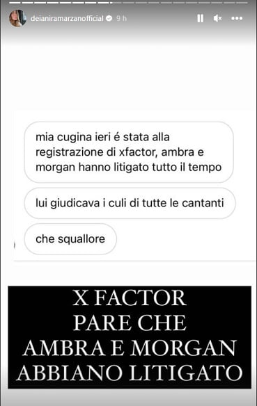 Questo quanto comunicato dalla fonte: “Mia cugina ieri è stata alla registrazione di X Factor. Ambra e Morgan hanno litigato tutto il tempo. Lui giudicava i cu*i di tutte le cantanti“. Ovviamente si tratta di una notizia da prendere con le pinze, in quanto non ci sono conferme dai diretti interessati.