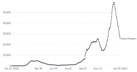 La curva dei nuovi casi di contagio mostra che, nel Regno Unito (Figura 1), la terza ondata è stata decisamente più dannosa delle due precedenti, ma che sta perdendo di intensità. La terza ondata, infatti, ha avuto un picco nei primi giorni del 2021 e sembra destinata ad esaurirsi verso la fine di febbraio, o appena dopo. Ovviamente, se non intervengono fatti nuovi.