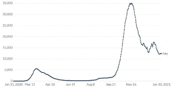 I nuovi casi di contagio della Germania (Figura 2) e dell’Italia (Figura 3) mostrano un andamento simile a quello del Regno Unito. Tuttavia, la sovrapposizione temporale tra la seconda e la terza ondata rende in Germania e Italia meno evidente l’effetto della terza ondata che sta imperversando nel Regno Unito. Anche la Francia (dati non esibiti, ma reperibili su Wikipedia) mostra una sovrapposizione tra ondate simile a quelle dell’Italia e della Germania.