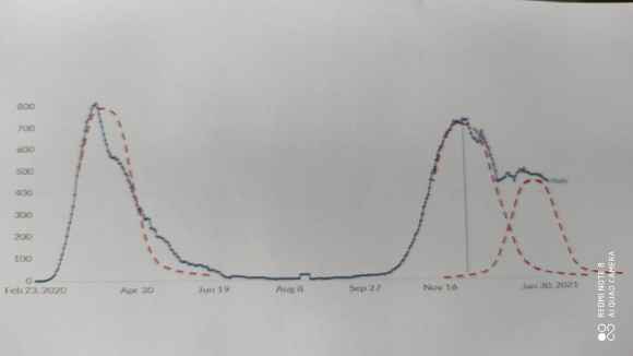 Nel grafico a sinistra della Figura 6, i segmenti (tratteggiati in blu) con i quali si è ipotizzata la terza ondata sono le differenze tra i morti ipotizzati come conseguenza della seconda ondata (curva in rosso) e quelli effettivamente registrati, a partire da novembre 2020, dal sistema di tracciamento dei casi.