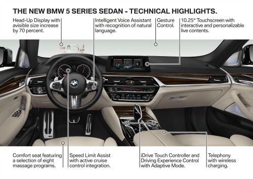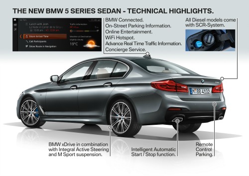 Al massimo comfort a bordo provvedono anche le soluzioni porta-oggetti ampliate, il maggiore spazio alle gambe nella zona posteriore e i sedili comfort con funzione di massaggio, analogamente all’innovativo comando del sedile attraverso sensori sensibili al tatto oppure al comando della climatizzazione a quattro zone, inclusa la ionizzazione e la leggera profumazione dell’aria. Un particolare sistema d’incapsulamento del motore (SYNTAK), il parabrezza e il cielo del tetto a isolamento acustico riducono in modo sensibile la rumorosità nell’abitacolo. Tutti i proiettori della BMW Serie 5 berlina sono equipaggiati di serie con tecnica LED. Come optional sono disponibili proiettori adattivi a LED con distribuzione variabile del fascio luminoso, inclusa la luce per le rotatorie e la luce abbagliante antiriflesso BMW Selective Beam dalla portata fino a 500 metri.La nuova BMW Serie 5 affascina anche a livello d’interconnessione: a questo scopo l’ampia offerta di BMW ConnectedDrive è stata integrata da servizi nuovi che consentono al professionista in viaggio di aumentare il comfort e di risparmiare del tempo. Questi comprendono la nuova offerta ParkNow per la prenotazione e il pagamento digitali di parcheggi, la ricerca intelligente di parcheggio On-Street Parking Information e il Park Assistant, offerto come optional, che rileva posti liberi e parcheggia automaticamente la vettura. Grazie al servizio Microsoft Exchange, per la prima volta gli utenti di Microsoft Office 365 potranno sincronizzare le e-mail, gli appuntamenti nel calendario e i contatti e gestirli anche a bordo della vettura. Con l’optional Remote Parking la nuova BMW Serie 5 può essere telecomandata con la chiave della vettura in parcheggi particolarmente stretti. Inoltre, è stata ulteriormente ottimizzata l’integrazione di smartphone: da Apple CarPlay, che per la prima volta è stato integrato da un produttore automobilistico completamente senza cavi, alla carica induttiva del telefono e al WiFi-hotspot per un massimo di dieci dispositivi.