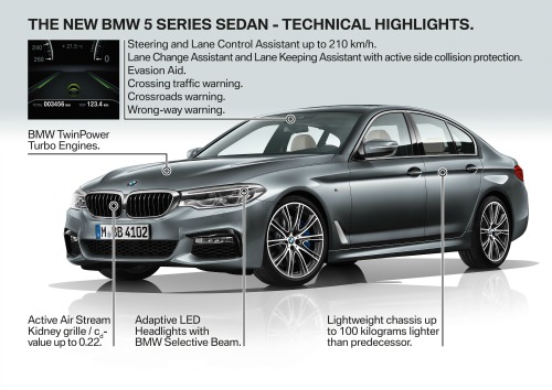 La nuova Serie 5 sarà innanzitutto più leggera, grazie a un maggiore utilizzo dell’alluminio e di acciai altoresistenziali: fino a 100 kg in meno rispetto al modello precedente. Un cambiamento che portato a dover riprogettare l’assetto ex novo. Il baricentro basso della vettura, la tipica ripartizione equilibrata delle masse tra gli assi delle vetture BMW e una scocca ad altissima resistenza alla torsione uniscono un’esperienza di guida dalla massima dinamica con il tipico comfort di viaggio della BMW Serie 5. Diverse opzioni a livello di assetto, come Integral Active Steering, combinabile adesso anche con la trazione integrale intelligente xDrive, completano il pacchetto sviluppato per offrire una dinamica di guida con la quale la BMW Serie 5 si posiziona nuovamente al vertice della propria classe. Con un coefficiente di resistenza aerodinamica fino a cx = 0,22 la nuova BMW Serie 5 berlina dalla lunghezza di 4.935 millimetri marca nuovamente il migliore valore della categoria di appartenenza. La nuova BMW Serie 5 offre al conducente il massimo supporto, non solo in situazioni critiche, ma anche in quelle che dal punto di vista della guida non risultano particolarmente impegnative, come la guida in colonna, nel traffico lento e su monotoni tratti autostradali. A questo scopo è dotata di serie di una telecamera stereo che in combinazione con i sensori radar e a ultrasuoni, offerti come optional, sorveglia l’ambiente che circonda la vettura. Oltre all’Assistente per evitare un ostacolo o l’Avvertimento di traffico trasversale, novità introdotte nella nuova BMW Serie 5 sono anche l’Assistente per il cambio di corsia e l’Assistente di mantenimento della corsia con protezione attiva anticollisione laterale. Quest’ultimo sorveglia le carreggiate e la circolazione intorno alla vettura e supporta attivamente il guidatore in caso di rischio imminente di collisione, intervenendo attivamente sul volante. Con le funzioni ampliate della regolazione attiva della velocità (Active Cruise Control, ACC), offerta come optional, e dell’Assistente allo sterzo e di mantenimento della corsia, la BMW Serie 5 compie un ulteriore passo verso la guida automatizzata. Questo include la considerazione dei limiti di velocità, forniti al tempomat dall’optional Intelligent Speed Assist, con la possibilità per il guidatore di correggere il valore di +/– 15 km/h. A richiesta, la vettura esonera il conducente dalle manovre di accelerazione, di frenata e di sterzo da fermo fino alla velocità di 210 km/h. La funzione Auto Start Stop intelligente agisce adesso in dipendenza del percorso della strada e del traffico, offrendo un livello superiore di comfort di guida.