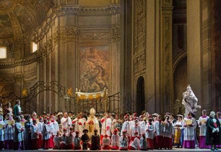 Nell’edizione in scena a Roma sino a fine giugno (in due tornate di repliche), Tosca viene presentata così come lo fu il 14 gennaio 1900. Sulla base di bozzetti delle scene e dei costumi (di Adolf Hohenstein) e di foto dell’epoca, i laboratori e la sartoria hanno fatto un attento lavoro di ricostruzione. Le scene, ispirate in gran misura ai paesaggisti francesi di fine Ottocento sono una gioia per gli occhi. I costumi di Floria Tosca, specialmente quello del primo atto, incantarono la Regina Margherita; ed è facile capire perché.