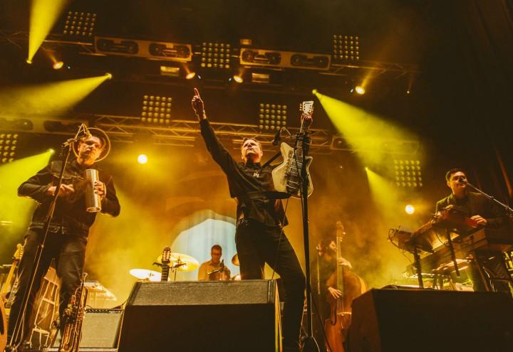 Le atmosfere dei primi brani sono più propriamente rock, ma è solo questione di tempo, perché cumbia e sonorità latine sono dietro l’angolo. Across The Wire e Cumbia de Donde, ad esempio – la seconda arricchita da un’incursione su Bella Ciao, grazie alla comparsa sul palco del cantautore abruzzese Domenico Imparato – portano sul palco la fiesta messicana, mentre le incursioni dentro il deserto dell’Arizona colorano di sfumature i ritmi ancora latini di Sonic Wind e Victor Jara’s Hands, canzone, quest’ultima, che s’ispira alla figura del cantautore e poeta cileno ucciso da Pinochet e che viene introdotta da poche semplici parole di pace di Burns: “siamo un solo popolo, per un solo pianeta”. La band regge il passo di uno straordinario melting pot sonoro, grazie ad una padronanza tecnica che le consentirà di resistere per due ore di show senza interruzione. Oltre alla bella voce ed alla chitarra di Burns ed alla solida sezione ritmica basata sul drumming preciso di Convertino e sui virtuosismi al basso di Scott Colberg, si compone dell’eccellente chitarrista Depedro, alias Jairo Zavala Ruiz, vocalist aggiunto nei brani in lingua spagnola, e dei multistrumentisti Martin Wenk, Jacob Valenzuela e Sergio Mendoza, che passano con disinvoltura dalla tromba a chitarre, mandolino, fisarmonica e tastiere. Ogni brano è un continuo via vai sonoro e quella frontiera tra il rock americano e i suoni di altre latitudini viene oltrepassata di continuo. La band compie continue scorribande sonore, e il pubblico si coinvolge sempre più, batte le mani, segna il tempo, canta in coro i versi delle canzoni che conosce, raccogliendo persino l’invito a duellare con la chitarra di Depedro, che gioca con il pubblico facendogli sottolineare con la voce ogni nota di un suo assolo.