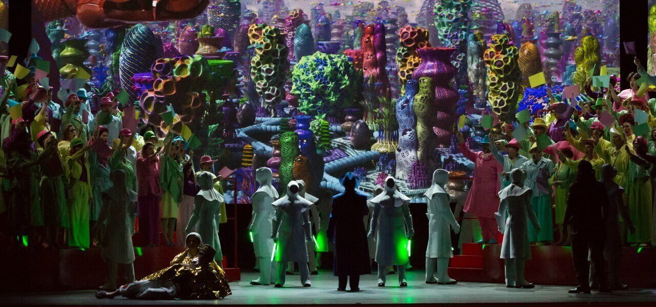 Lo sono quelle di AES+ F? Occorre discuterne. AES+ F sono un gruppo di tre artisti nato nel 1987 a cui si è aggiunto un quarto nel 1995. Hanno avuto riconoscimenti internazionali di peso da anni; ad esempio, hanno rappresentato il Padiglione Russo alla Biennale d’Arte contemporanea di Venezia già nel 2007. Sono di casa a Berlino, a New York, a Parigi ed anche a Tel Aviv, a Sydney, a Toronto. E via discorrendo. Sono artisti del visivo computerizzato e a tre dimensioni. Le loro ‘installazioni’ sono note in tutto il mondo. Lavorano – mi si dice- in un laboratorio messo a loro disposizione dal gigante energetico Gazprom in un grattacielo avveniristico di San Pietroburgo. Come indicato, è la prima volta che si accostano alle arti sceniche dal vivo in generale ed all’opera lirica in particolare.