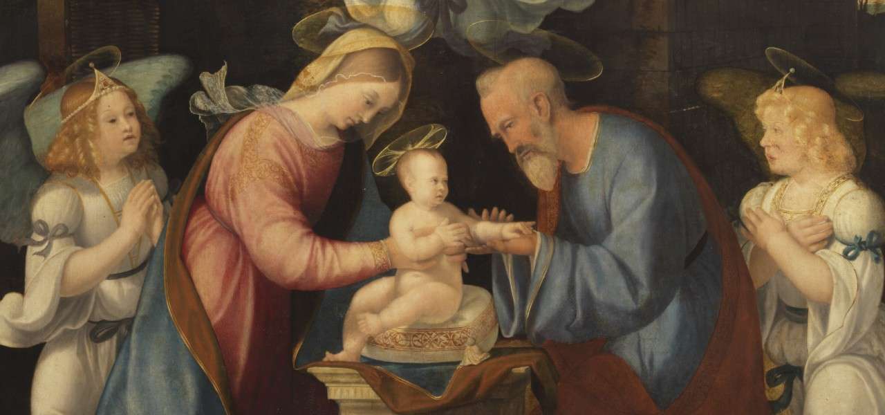 La più antica ed elegante è una pala d’altare solo da pochissimi anni riconosciuta opera di Andrea Previtali (anni intorno al 1520). Proviene dal contesto bergamasco, ed è rimasta a lungo sconosciuta anche perché trasferita in tutt’altro ambito territoriale e finita, attraverso i meccanismi delle donazioni aristocratiche, in un santuario mariano dell’hinterland milanese: precisamente ad Arconate. Diversamente da altre opere sul tema natalizio del pittore lombardo, qui l’attenzione si concentra sullo scambio amoroso degli affetti nella triade della Sacra Famiglia, stretta intorno al Bambino divino, senza coinvolgere gli altri abituali protagonisti dei racconti tramandati in merito alla nascita e ai primi momenti dell’esistenza di Gesù. Ma lo sfondo su cui si staglia la scena di intimità domestica non tralascia di chiamare in causa in modo diretto il soprannaturale: tre angeli, ordinatamente disposti a triangolo, incorniciano i corpi dei santi genitori piegati sulla loro sublime creatura, e uno di questi angeli irrompe con le braccia raccolte nel gesto della preghiera planando in volo da un cielo di cui si intravedono scampoli lontani nel paesaggio rappresentato nella zona superiore del dipinto.