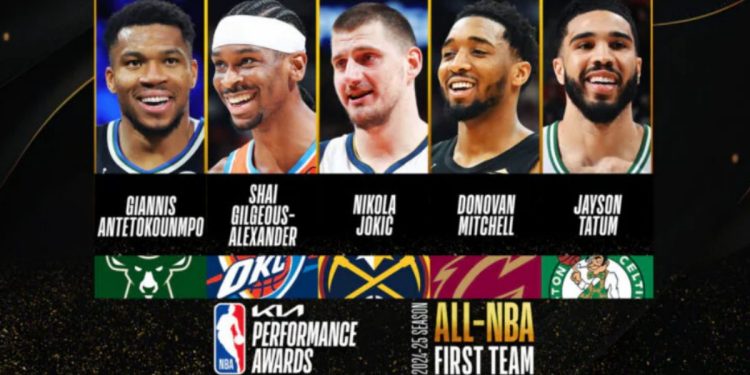Il primo quintetto vede tra i suoi componenti i tre finalisti per il premio dell’MVP, Shai Gilgeous-Alexander che ovviamente è una delle guardie avendo vinto il premio di miglior giocatore della lega, Nikola Jokic che ha registrato 30 punti, 13 rimbalzi e 10 assist di media, e Giannis Antetokounmpo, autore di una stagione da 30 punti, 12 rimbalzi e 6 assist di media. Gli ultimi due membri del quintetto sono poi Donovan Mitchell, che ha registrato una media di 24 punti, 4 rimbalzi e 5 assist, e Jayson Tatum che invece ha concluso l’anno con 27punti, 9 rimbalzi e 6 assist di media.