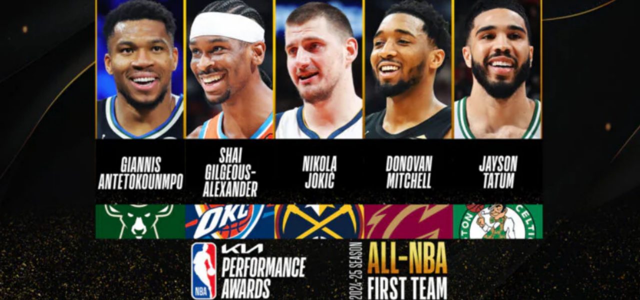 Il primo quintetto vede tra i suoi componenti i tre finalisti per il premio dell’MVP, Shai Gilgeous-Alexander che ovviamente è una delle guardie avendo vinto il premio di miglior giocatore della lega, Nikola Jokic che ha registrato 30 punti, 13 rimbalzi e 10 assist di media, e Giannis Antetokounmpo, autore di una stagione da 30 punti, 12 rimbalzi e 6 assist di media. Gli ultimi due membri del quintetto sono poi Donovan Mitchell, che ha registrato una media di 24 punti, 4 rimbalzi e 5 assist, e Jayson Tatum che invece ha concluso l’anno con 27punti, 9 rimbalzi e 6 assist di media.