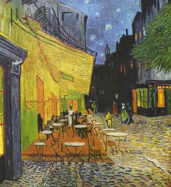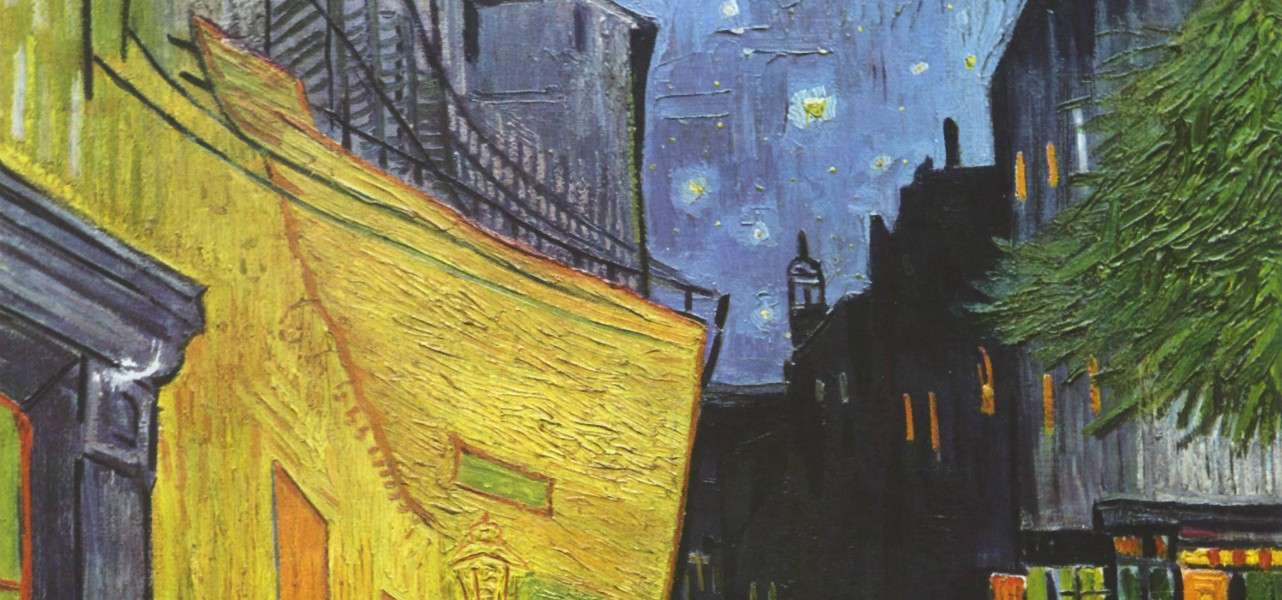 La scelta di accendere violentemente l’angolo del caffè, facendolo esplodere in un trionfo di variegati cromatismi, mette ancor più in evidenza l’ora tarda: insiste Van Gogh sulla notte sbriciolando nel cielo bluastro il palpito incandescente delle stelle che ammiccano silenziose. Avvampano le luci della sera. Trema di un’intimità calda e vibrante il lampione a gas in primo piano protendendosi, elegante, sotto la tettoia del caffè ad inondare ogni cosa della sua iridescenza. Si nutrono a quella luce, avventori e passanti. Vi si specchia compiaciuto anche un pino affacciato sulla destra della tela, quasi a chiudere, con i suoi fitti rami, lo spazio di una piazza che il nostro sguardo può solo limitarsi ad immaginare.