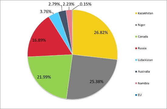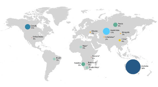 Anche a livello mondiale, il Kazakistan occupa ormai da tempo il primo posto con il 45% della produzione, seguito a distanza da Canada (15%), Namibia (11%) e da Australia, Uzbekistan, Russia e Niger, tutti sotto al 10% (dati 2022).