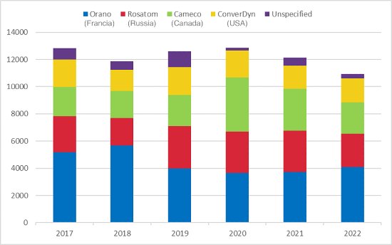 Conversione in UF6 per l’Ue, per fornitore, dal 2017 al 2022 (in tonn. U). Fonte Esa