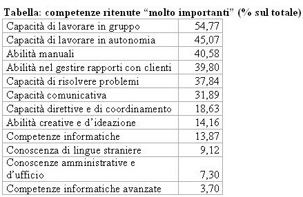 Complessivamente, i dati della tabella mostrano che le imprese italiane richiedono poche competenze “tecniche” (abilità informatiche, linguistiche, amministrative), mentre sono in forte domanda le competenze trasversali quali la capacità di lavorare in gruppo, di risolvere i problemi e comunicativa. Infatti, tra le prime sei competenze più richieste quattro sono di natura “trasversale”; fanno eccezione le abilità manuali, e quelle di gestire i rapporti con i clienti.