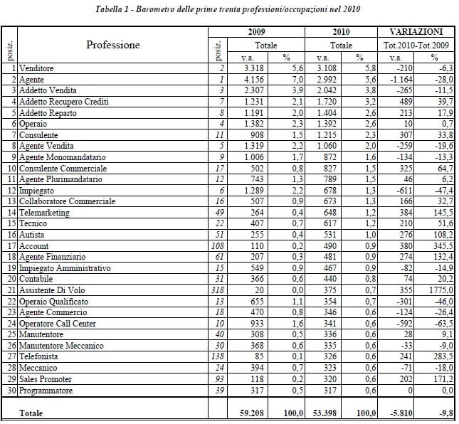 Nota Metodologica: Questo barometro è ottenuto eliminando dal conteggio tutte le singole inserzioni che offrano un numero di posti di lavoro superiore al 50% del totale dei posti di lavoro registrati nell’anno per la singola professione ricercata. Ad esempio, se una singola inserzione richiede 1951 “agenti” (pari alla metà +1 degli agenti ricercati nel 2010), quella inserzione non viene conteggiata in questo barometro. La regola non viene applicata agli annunci che offrano meno di 500 posti di lavoro (nel singolo annuncio).