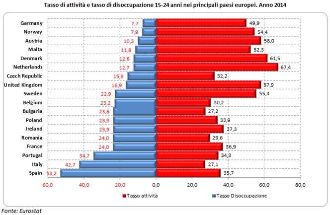 C’è una interessante lettura che si può fare dei dati (riportati nel grafico a fondo pagina) su tasso di attività e tasso di disoccupazione dei giovani fino a 24 anni, confrontati fra i vari paesi. Un confronto che per il 2014 mostra, guardando ai principali paesi europei, una significativa correlazione inversa tra questi due indicatori, per cui ai valori più alti dell’uno corrispondono i valori più bassi dell’altro e viceversa (per i pignoli, il relativo coefficiente di correlazione è pari a -0,6229). Il tasso di disoccupazione più basso è quello tedesco – qualcuno direbbe dell’odiata Germania – appena il 7,7%, in presenza di un tasso di attività giovanile del 49,9% (simile a quello che in Italia si è avuto fino agli anni Ottanta), non il più alto in assoluto, ma certamente della “fascia alta”; il tasso di attività più alto è quello olandese 67,4%, al quale si accompagna un tasso di disoccupazione del 12,5%, indubbiamente da “fascia bassa”. All’altra estremità del grafico, Italia e Spagna, in condizione diametralmente opposta: bassi tassi di attività (quello italiano, 27,1% ,è il più basso in assoluto), affiancati da tassi di disoccupazione ai massimi (42,7% l’Italia, 53,2% la Spagna).