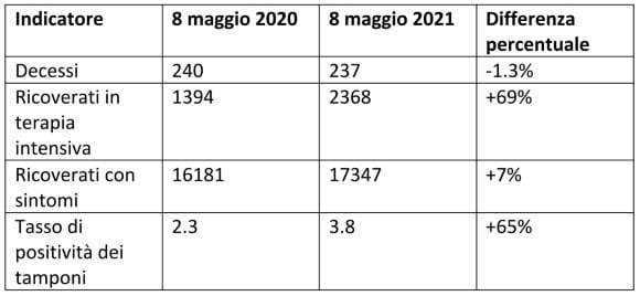 Tuttavia, questi numeri assolutamente incoraggianti non devono indurci ad abbassare la guardia come se la pandemia fosse ormai alle spalle. L’anno scorso eravamo infatti in una situazione migliore di quella attuale quanto a numeri assoluti, eppure eravamo psicologicamente molto più cauti e disposti ad affrontare ancora il lockdown più severo per 10 ulteriori giorni prima delle prima timide riaperture. Guardando la tabella seguente, in effetti, notiamo che il numero dei decessi giornaliero un anno fa era sostanzialmente identico a quello odierno, mentre tutti gli altri valori erano più bassi di quelli attuali, in particolare il tasso di positività ed i ricoverati in terapia intensiva. I ricoverati in terapia intensiva oggi sono circa il doppio di quelli dell’8 maggio 2020!