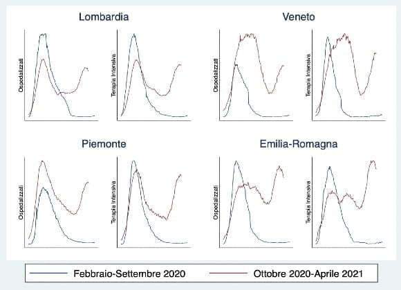 Il grafico prende in considerazione le 4 regioni più colpite e confronta l’andamento nelle due ondate del numero di ospedalizzazioni e di ricoveri in terapia intensiva. Due osservazioni immediate: 1) la seconda ondata in Lombardia sembra aver avuto un impatto meno dirompente rispetto alle altre regioni; 2) il sistema a colori non consente di flettere le curve fino a congelare la diffusione del virus e chi per più tempo è rimasto in zona gialla (ad esempio il Veneto) ha avuto una crescita costante fino all’adozione di misure più stringenti. La zona rossa funziona, ma non appena si allentano le misure, il contagio ricresce e gli ospedali tornano a riempirsi.