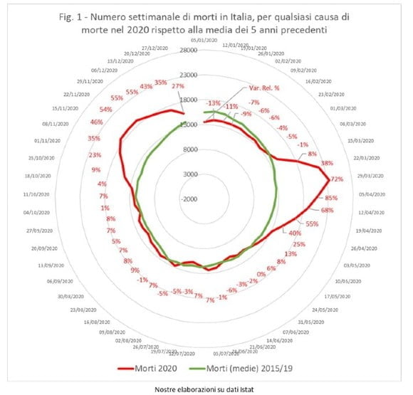 L’Istat ha recentemente certificato che nel 2020 si sono verificate 746.146 morti per qualsiasi causa di morte, a fronte di 645.620, numero medio di morti nel quinquennio 2015-2019. Questo ha comportato 100.526 morti in più, pari ad una variazione relativa percentuale del +15,6%. Questi morti in eccesso sono in gran parte dovuti alla pandemia, come ben si può vedere dalla Figura 1, la quale riporta il numero di morti nel 2020, quello medio negli anni 2015-19 e la variazione percentuale relativa, per ogni settimana del 2020.