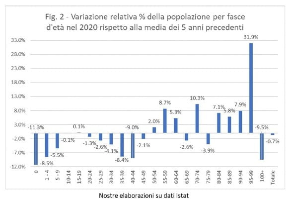 Il dato sull’incremento del tasso di mortalità (+8,3%), relativamente basso, è la media di una situazione completamente diversa tra le fasce di età: i minori di 50 anni hanno goduto di una riduzione del tasso di mortalità, mentre oltre i 50 anni l’incremento è arrivato anche al 15%.