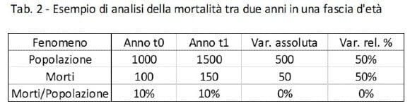 Nell’anno t0 la popolazione nella fascia di età prescelta è pari a 1.000, mentre nell’anno t1 è pari a 1.500, con un aumento del 50%. Il numero di morti nell’anno t0 è pari a 100, mentre nell’anno t1 è pari a 150, con un aumento che pure in questo caso è del 50%. Ma se si va a guardare il tasso di mortalità nei due anni, dato dal rapporto morti/popolazione, si rileva che in entrambi gli anni è del 10%. Quindi il tasso di mortalità non è variato! Se nell’anno t1 ci fosse stata una pandemia potremmo dire che questa abbia avuto effetto sulla mortalità?