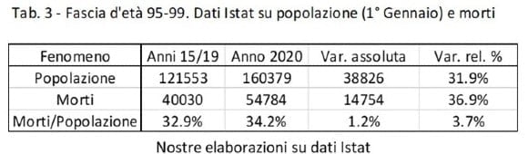 Quello che vogliamo dire qui è che considerare, ai fini della valutazione dell’impatto dell’epidemia e delle politiche di chiusura, la variazione relativa dei morti tra il 2020 e la media del quinquennio precedente, in vista delle notevoli variazioni della popolazione per le diverse fasce d’età, evidenziate in Figura 2, può risultare fuorviante. La Tabella 3 riporta i dati reali Istat osservati per la media del quinquennio 2015-19 e per il 2020 per la fascia d’età 95-99.