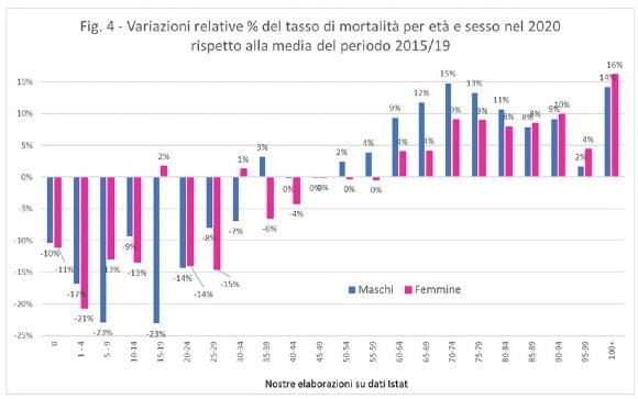Da sottolineare di nuovo il basso livello di incremento del tasso di mortalità nella fascia 95-99, in particolare per i maschi (solo +2%). Questi dati suggerirebbero che se la campagna vaccinale avesse dovuto iniziare dalle fasce di età più colpite queste sarebbero state quelle da 70 a 79 anni (oltre quella degli ultracentenari), che invece si sono trovate doppiamente svantaggiate.