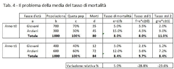 Nella Tabella 4 abbiamo una popolazione suddivisa in due fasce di età, giovani e anziani, in due anni diversi t0 e t1. Nell’anno t0 i giovani rappresentano il 70% della popolazione e gli anziani il 30%, mentre nell’anno t1 i giovani rappresentano solo il 40%, mentre gli anziani il 60%. Il numero dei morti è riportato nella colonna d e dividendo i morti per la popolazione nella rispettiva fascia di età (e = d/b) si ottiene il tasso di mortalità specifico per le diverse fasce di età nei due anni.