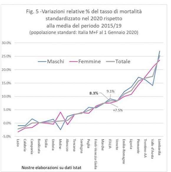 Dalla figura emerge che ci sono due regioni, Lazio e Calabria, dove si è assistito addirittura ad una riduzione del tasso di mortalità rispetto al quinquennio 2015-19. Altre regioni come Campania, Basilicata, Sicilia e Umbria hanno visto una stabilità nel tasso rispetto ai 5 anni precedenti; altre ancora come Molise, Abruzzo, Toscana, Sardegna hanno subìto incrementi inferiori al 4%. Il Friuli-Venezia Giulia ha sperimentato un incremento di circa il 6% (+12,6% nel numero di morti) sia per maschi che per femmine, comunque inferiore alla media nazionale, unica regione del Nord in questo. Tutte le regioni del Nord hanno subìto incrementi superiori alla media nazionale: in testa la Lombardia con un +25% di incremento nel tasso di mortalità, dato che comunque è abbastanza distante dal +36,9% nel numero di morti.