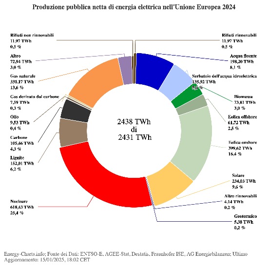 Nonostante tutto, l’energia nucleare si conferma la prima fonte di elettricità in Europa, con il 25%, distanziando l’eolico (19%) e il gas (13%). Un trend che continua da almeno tre anni. Complessivamente, le rinnovabili sono ormai al 45%, mentre le fossili mantengono un 25%.