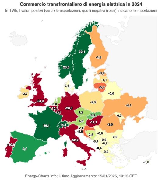 La Francia, nella quale l’elettricità viene prodotta al 70% col nucleare, ha “alimentato” sia l’Italia, sia la Germania: ha avuto una esportazione netta di ben 89 TWh, dei quali la maggioranza sono andati a coprire i fabbisogni dell’Italia, che ha importato complessivamente 52 TWh (sui 312 di consumi totali nel 2024), e in buona parte hanno risolto i problemi di approvvigionamento dei tedeschi, che hanno importato 28 TWh. A dicembre dell’anno scorso, poi, Berlino ha assorbito elettricità anche dalla Svezia, a causa del perdurare (per molte settimane) del “Dunkelflaute”, una situazione meteorologica sfavorevole nella quale il basso vento e la poca insolazione hanno pressoché azzerato la produzione delle rinnovabili tedesche. Questo import “forzato” ha però creato un aumento di 200 volte dei prezzi dell’elettricità sul mercato svedese, tanto che la vicepremier e ministro dell’Energia Ebba Busch il 12 dicembre si rivolgeva ai tedeschi in modo “furioso”, accusandoli di essere responsabili per l’impennata dei prezzi e per la riduzione della competitività dell’intera Europa, a causa della malsana decisione di chiudere le loro 14 centrali nucleari. Anche se i primi ad essersi inalberati probabilmente saranno stati gli stessi cittadini e le imprese tedesche, visto che in alcuni momenti il prezzo dell’elettricità in Germania ha toccato i 900 euro/MWh, in dicembre.