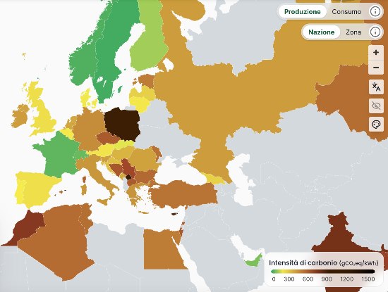 A dicembre 2024, la Francia ha emesso 40 grammi di CO2 equivalente per ogni kWh elettrico prodotto, contro i 400 della Germania e i 375 dell’Italia. Non è andato troppo meglio per noi e i tedeschi a luglio, con la massima produzione di fotovoltaico: 320 grammi per la Germania e 300 per l’Italia, a fronte di solo 20 grammi per la Francia.
