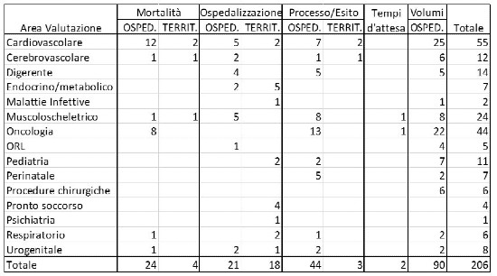 Come traspare dalla Tabella 1, non tutte le aree sanitarie sono coperte dalla valutazione e per le discipline indagate la copertura è molto eterogenea: si va da pochi indicatori (Psichiatria, Malattie infettive, Pronto soccorso) a moltissimi (Cardiovascolare, Oncologia); con una netta prevalenza di indicatori provenienti dai dati di ricovero anche quando si vogliono misurare gli esiti, ad esempio, dell’assistenza territoriale.