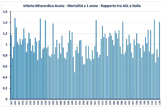 La Figura 1 dettaglia, a titolo di esempio, i risultati disponibili per l’indicatore “Infarto Miocardico Acuto – Mortalità a 1 anno”, presentando i rapporti tra il valore riscontrato in ogni singola ASL e il valore nazionale. Si osserva che in molte ASL tale rapporto è inferiore a 0,8 (cioè si muore di meno) mentre in altre il rapporto è superiore a 1,4 (cioè si muore di più).