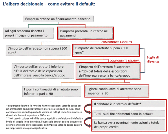 Da questo utile documento si possono comunque estrapolare i principali elementi di novità: «per arretrato rilevante si intende un ammontare superiore a 500 euro (relativo a uno o più finanziamenti) che rappresenti più dell’1% del totale delle esposizioni dell’impresa verso la banca. Per le persone fisiche e le piccole e medie imprese con esposizioni nei confronti della stessa banca di ammontare complessivamente inferiore a 1 milione di euro, l’importo dei 500 euro è ridotto a 100 euro». Per giungere allo stato di default, il debitore, deve maturare «arretrati di pagamento rilevanti per oltre 90 giorni consecutivi».