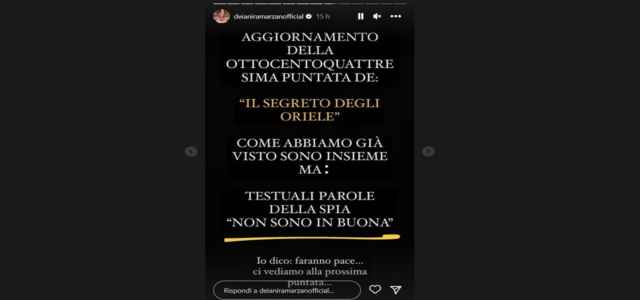 Mentre i fan esultano per la ritrovata armonia di Oriana Marzoli e Daniele Dal Moro, Deianira Marzano pubblica un aggiornamento sullo stato della coppia. “Aggiornamento della ottocentesima puntata de Il segreto degli Oriele: come abbiamo già visto sono insieme ma, testuali parole della spia, non sono in buona”, si legge nel post condiviso da Deianira.
