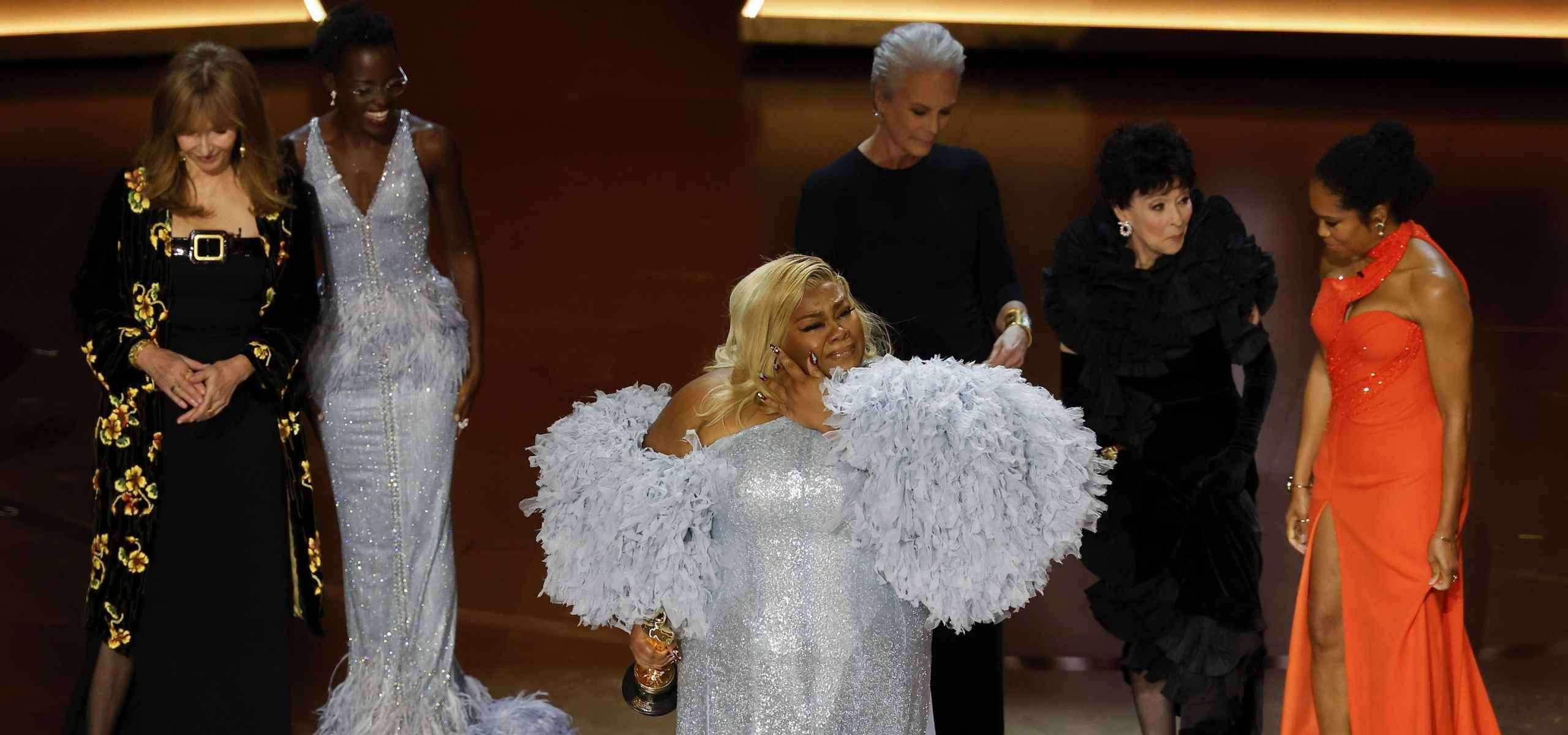 Ma a proposito di gratitudine, qua e là in una serata di diffuso “buonismo”, qualche lampo di sincerità lo si è visto. Come quando Da’Vine Joy Randolph, con la sua massiccia figura curiosamente addobbata, è salita sul palco per ricevere l’Oscar come miglior attrice non protagonista (The Holdovers). Vincendo singhiozzi e lacrime ha esordito ripetendo due volte “God is so good”, Dio è cosi buono, per poi raccontarci in due parole – e sempre tra lacrime di gratitudine – del suo cammino come unica ragazza di colore alla scuola di recitazione e del percorso di scoperta di voler essere non “diversa”, ma se stessa. E tutto ciò parlando a braccio, cosa abbastanza rara sul palco del Dolby Theater dove di solito i vincitori tirano fuori quei tristissimi foglietti stropicciati che hanno preparato nella speranza della realizzazione di un sogno. Foglietti affascinanti come la lista della spesa dove da giorni hanno elencati tutti quei personaggi che si aspettano di essere citati in caso di vittoria. Elenchi senza arte né parte a cui prestano attenzione solo gli addetti ai lavori (forse).