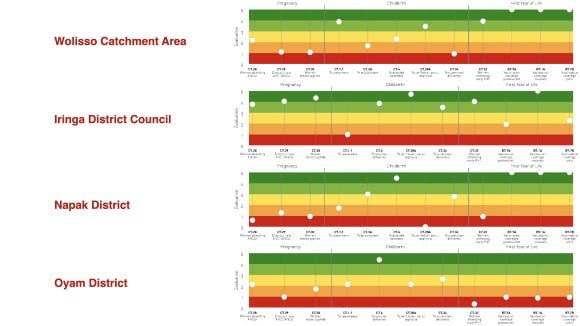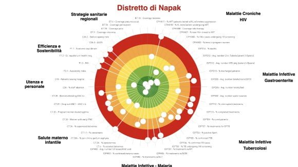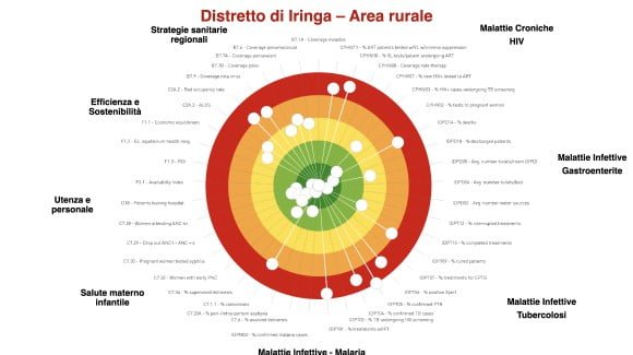 In un anno di lavoro sono stati raccolti quasi 120 indicatori. La figura 1 riassume la performance di sintesi attraverso i bersagli dei quattro contesti analizzati: l’ospedale St. Luke di Wolisso con il relativo territorio di riferimento, in Etiopia; l’ospedale di Tosamaganga con il distretto di Iringa District Council, in Tanzania; l’ospedale St. Kitiko di Matany con il distretto di Napak e l’ospedale di Aber con il distretto di Oyam, in Uganda.