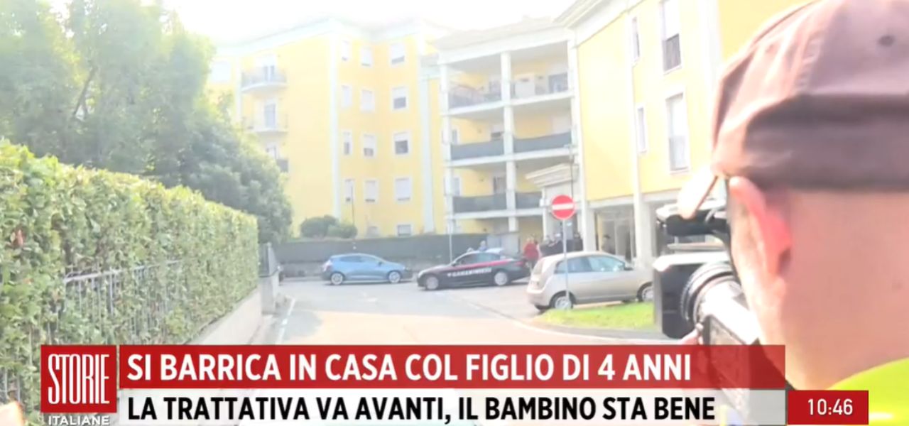 Secondo quanto riferito dall’inviato di “Storie Italiane”, trasmissione di Rai Uno condotta da Eleonora Daniele, il bambino è uscito dall’appartamento “scalzo, provato, in braccio alla mamma”. L’uomo, invece, non è ancora uscito dall’abitazione, come riferito al giornalista dal colonnello dei carabinieri, e sarebbero tuttora in corso le trattative tra lui e gli inquirenti.