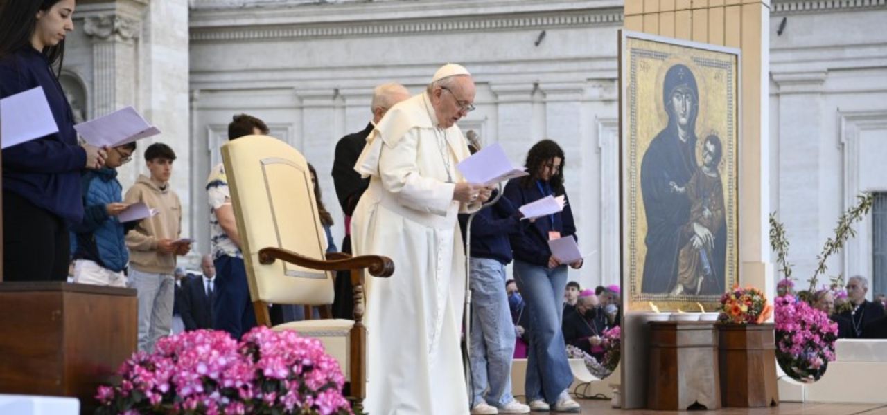 «Gesù ha vinto le tenebre della morte. Purtroppo, sono ancora dense le nubi che oscurano il nostro tempo. Oltre alla pandemia, l’Europa sta vivendo una guerra tremenda, mentre continuano in tante regioni della Terra ingiustizie e violenze che distruggono l’uomo e il pianeta. Spesso sono proprio i vostri coetanei a pagare il prezzo più alto: non solo la loro esistenza è compromessa e resa insicura, ma i loro sogni per il futuro sono calpestati. Tanti fratelli e sorelle attendono ancora la luce della Pasqua», ha poi sottolineato Papa Francesco riferendosi ai tanti giovani in Piazza e a casa, felici per aver passato un pomeriggio con momenti intensi e seri, così come svago e momenti emozionanti con il concerto di Blanco. Parlando infine dei momenti “bui” della vita di ciascuno, Papa Francesco ha intimato i giovani a superare la “paura del buio” nella compagnia che Dio mette di fianco ogni giorno: «il buio ci mette in crisi; ma il problema è come io gestisco questa crisi: se la tengo solo per me, per il mio cuore, e non ne parlo con nessuno, non va. Nelle crisi si deve parlare, parlare con l’amico che mi può aiutare, con papà, mamma, nonno, nonna, con la persona che può aiutarmi. Le crisi vanno illuminate per vincerle». Chiudendo il pellegrinaggio, il Pontefice ha ringraziato tutti gli adolescenti giunti fin lì: «Io non vorrei dilungarmi tanto, soltanto vorrei dire che è importante che voi andiate avanti. Le paure? Illuminarle, dirle. Lo scoraggiamento? Vincerlo con il coraggio, con qualcuno che vi dia una mano. E il fiuto della vita: non perderlo, perché è una cosa bella. E, nei momenti di difficoltà, i bambini chiamano la mamma. Anche noi chiamiamo la nostra mamma, Maria. Lei – state attenti –aveva quasi la vostra età quando accolse la sua vocazione straordinaria di essere mamma di Gesù».