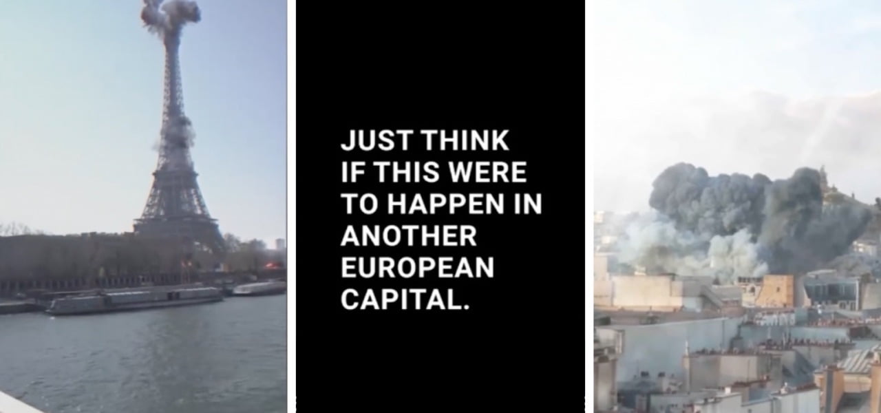Si è scelto così di far vedere com’è vivere qualcosa che si ritiene non possa accadere. In una scena la Tour Eiffel soccombe dopo una esplosione. “Pensa se ciò dovesse accadere in un’altra capitale europea”, dice il testo in sovraimpressione. Il video di propaganda fa riferimento alla richiesta del presidente ucraino alla Nato e all’Europa di istituire una no fly zone sull’Ucraina per evitare ulteriori bombardamenti. Da settimane ripete quanto sia importante vietare l’ingresso degli aerei russi nei cieli ucraini. Un appello inascoltato.