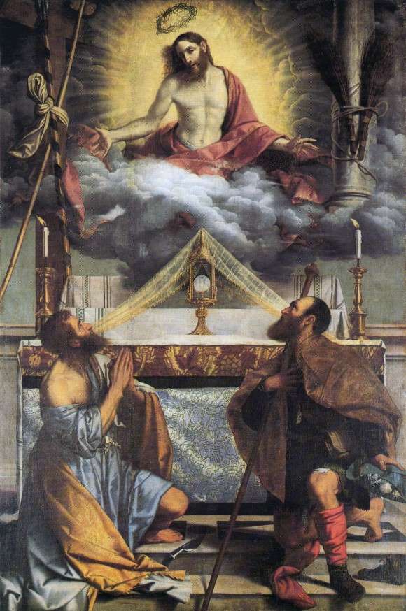 Il trionfo di Pasqua resta, così, intimamente intrecciato allo svuotamento del Venerdì santo, nel continuum di un unico mistero di salvezza dilatato nel tempo. Ma è notevole che questo beneficio di grazia non sia relegato in un oltremondo inaccessibile. Il Cristo di Moretto discende dall’alto del suo regno celeste fin quasi ad adagiarsi su un altare in tutto simile a quello delle celebrazioni nelle chiese. E al centro della mensa eucaristica, che coincide con il centro geometrico del dipinto, spicca l’ostensorio con il candido disco dell’ostia messo in piena evidenza, oggetto del culto e della preghiera devota a cui la comunità dei parrocchiani veniva incisivamente richiamata. Nell’atto dell’affidamento fiducioso alla protezione risanatrice di Cristo sono gli stessi santi titolari della chiesa del luogo, i più cari alla devozione collettiva, a piegarsi in segno di ammonimento esemplare. Inginocchiati ai piedi dell’altare, rivolgono a Cristo il loro sguardo supplichevole, oppure a lui rinviano con il cenno della mano che indica. Il centro a cui riconoscere l’autentico primato sta sopra di loro. E questo centro si rende incontrabile, comunica sé stesso e diventa pilastro di appoggio a cui sostenersi nel segno concreto del santo sacramento del suo corpo passato attraverso la morte e ritornato a una vita più vera.