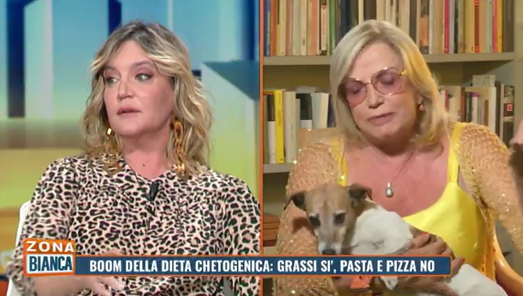 Patrizia Groppelli è stata ospite nella serata di ieri presso il programma Zona Bianca Estate, noto talk di politica e attualità in onda la sera su Rete 4 e condotto da Giuseppe Brindisi. Si parla di diete in studio e la nota Simona Izzo si è presentata in collegamento con il suo cagnolino: “Volevo dirvi che il mio cane fa una dieta chetogenica, visto che non ci sono i carboidrati nei croccantini”, a quel punto è esplosa la Groppelli: “Ma Izzo non ti si può sentire che fai fare la dieta chetogenica al cane, ma cosa mangia? Dai”.